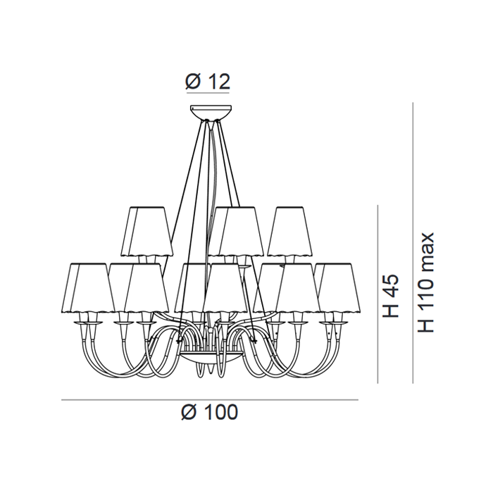 Dimensioni: diametro 100 cm x H. 110 cm max, 15 diffusori diametro 13 cm x H. 12 cm